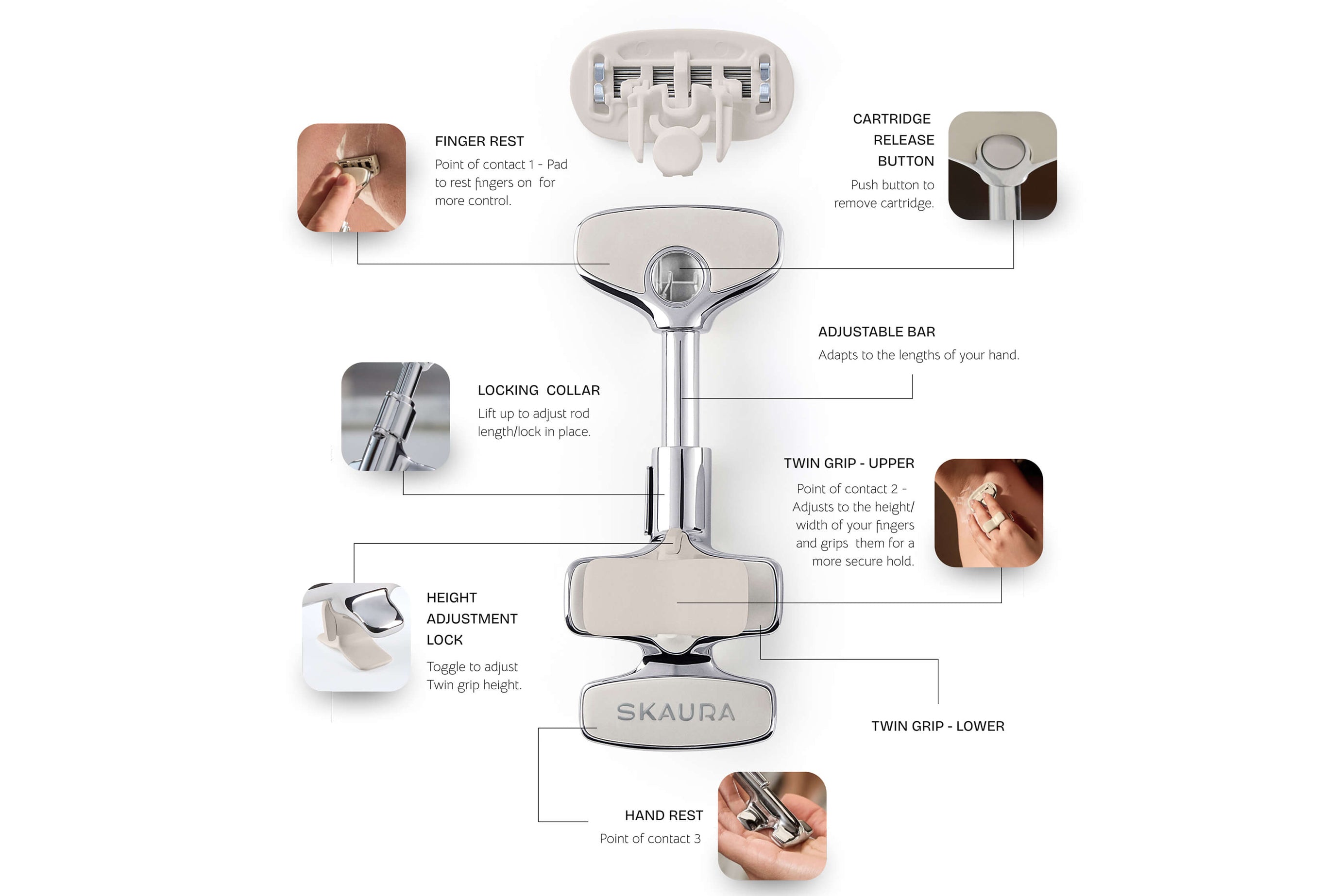 Three points of contact on the SKAURA ONE™ Razor provide increased stability and controlreducing friction, nicks, and cuts.
